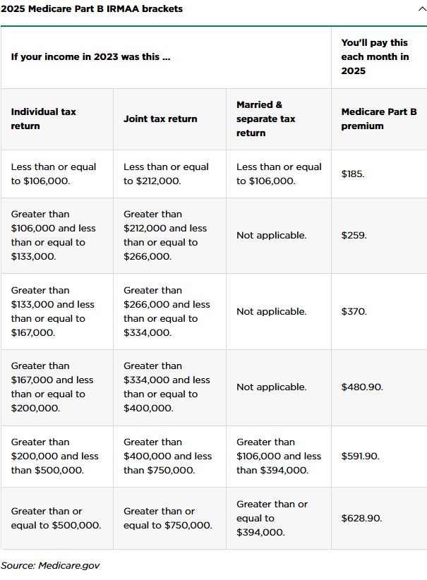Notice the two-year delay? Your 2025 Medicare premium is based on your 2023 income. That big bonus you got back then? You’re paying for it now.