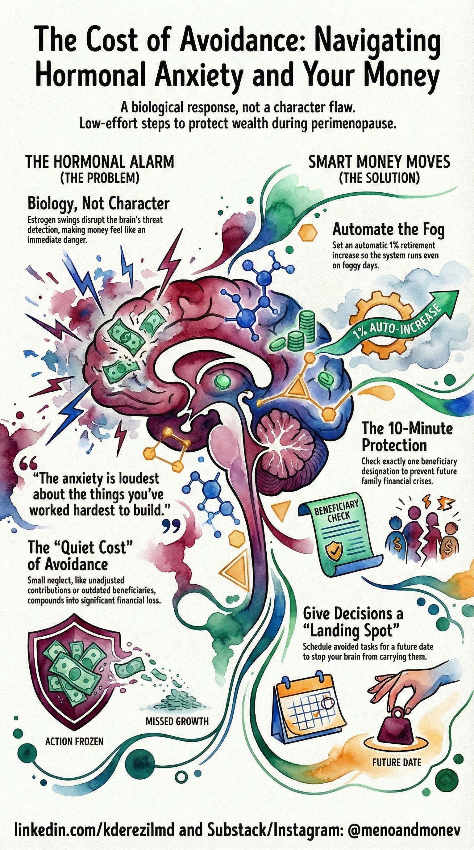 Reality: During perimenopause, estrogen swings directly disrupt the part of your brain that decides what’s a real threat and what isn’t. Your brain’s alarm system misfires. Money—because it feels concrete and controllable—becomes a lightning rod for that fear.